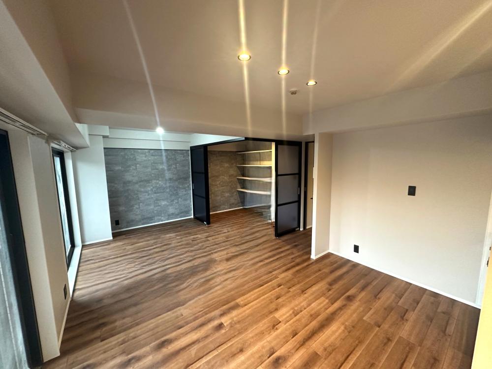 。ミッドナイトブルーのLDKの扉、明かりの入る引戸、様々なタイプのアクセントクロス等、デザイナーが選び抜いた部材を使用し、スタイリッシュな空間に生まれ変わっています。