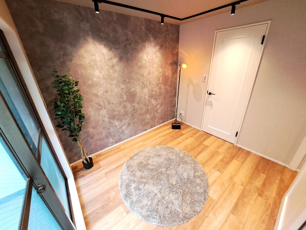 空間を引き締める一面のアクセントクロスが、部屋に深みを与えます。