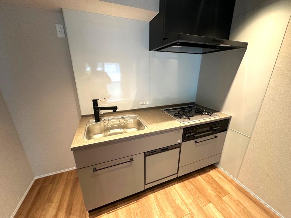 3口コンロ、グリル、浄水器、食器洗浄機付、明るいキッチンでお料理も楽になるよう仕立てました。