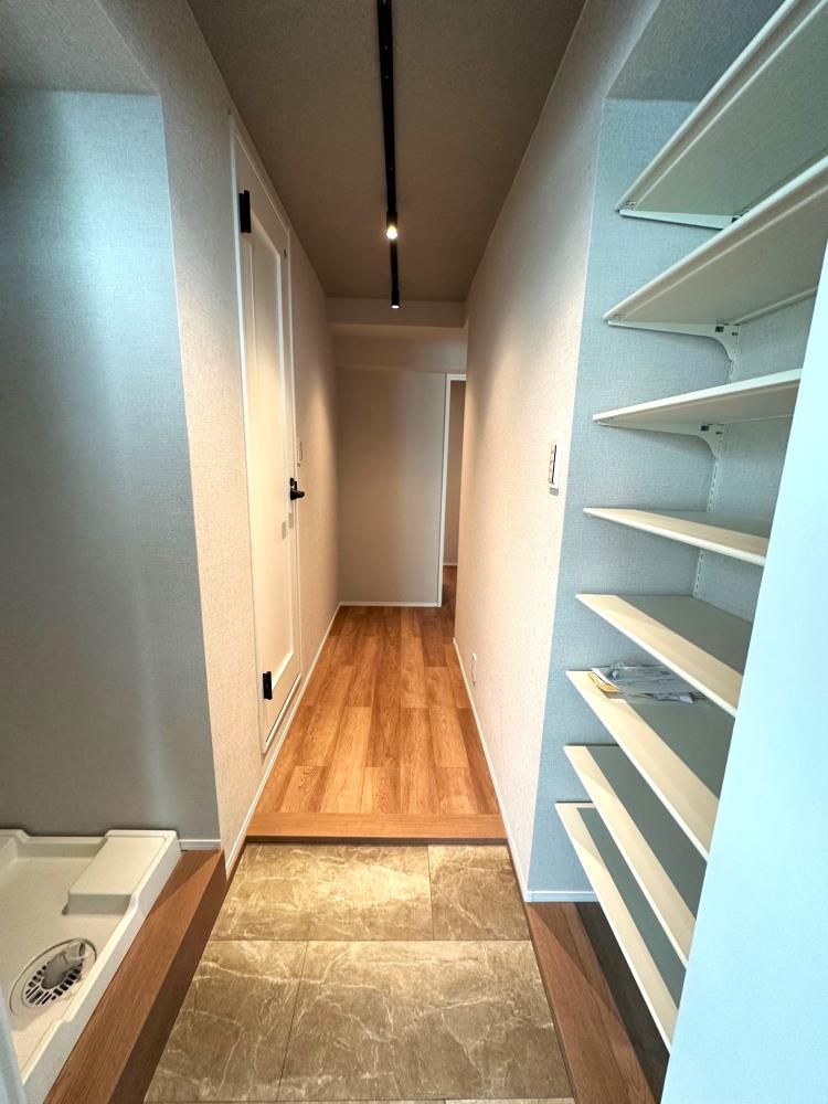 シューズボックス完備。木目調の床がシンプルで上品な印象の玄関に仕立てました。